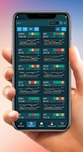 Turn your phone sideways and you’ll get a bigger version of the chart you are viewing, plus side scroll to jump to the next stock in your Watchlist.